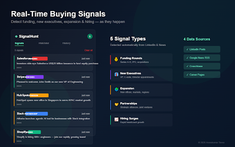SignalHunt — это дополнение для Chrome, разработанное для улучшения продаж путем мониторинга публикаций в LinkedIn на предмет сигналов о покупке. Оно отслеживает ключевые индикаторы, такие как новое финансирование, назначения руководителей и рост найма из нескольких источников данных, предоставляя пользователям своевременные уведомления. Как только сигнал обнаружен, он генерирует индивидуальные сообщения для обращения, которые можно настроить перед отправкой, обеспечивая персонализированный подход. С акцентом на эффективность, SignalHunt упрощает процесс выявления потенциальных клиентов и эффективного обращения к ним.